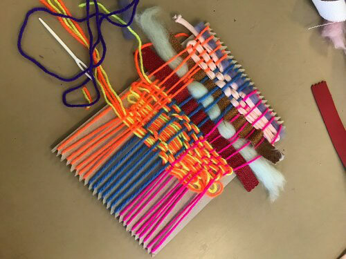 Over the course of a day, I worked with the class of students to make a loom, warp a loom, and create a small woven textile piece. I encouraged them to try things out, allowing them to make mistakes in order for them to problem solve creatively. I talked to the class about colours and textures, and how colours can be linked to feelings and emotions.